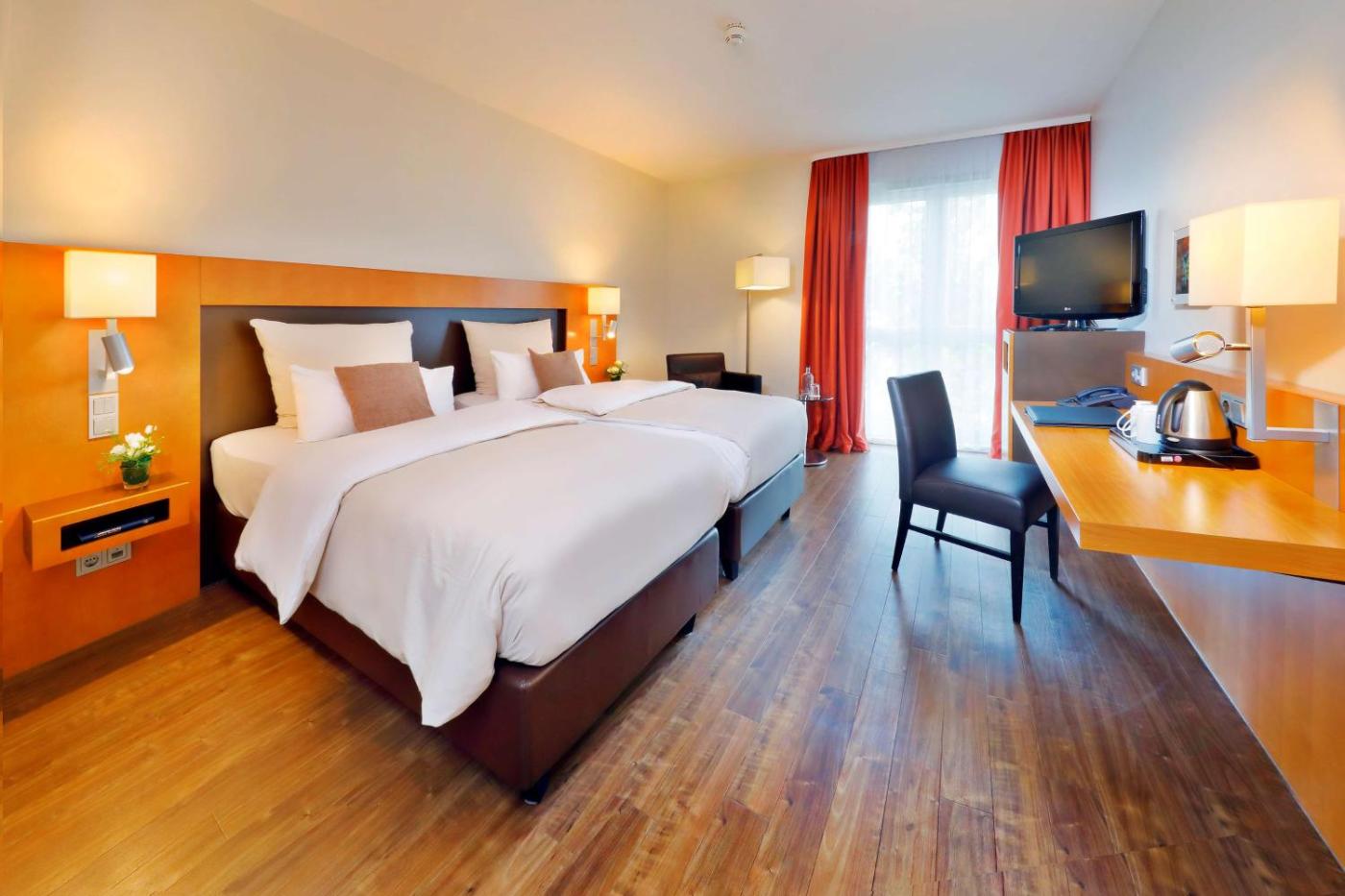 Business Double Room. Spacious room with modern décor. Includes air conditioning, cable TV and a private bathroom. These rooms either enjoy a quiet location and overlook the courtyard, or are located on the 4th floor with great views of Frankfurt.. ;