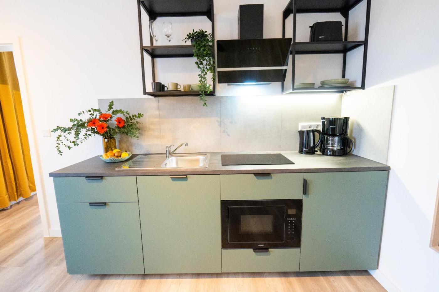 One-Bedroom Apartment. Featuring a private entrance, this apartment also comprises 1 bedroom, a seating area and 1 bathroom with a walk-in shower and a hairdryer. Guests can make meals in the kitchen that is equipped with a stovetop, a refrigerator, kitchenware and a microwave. The apartment provides a washing machine, a tea and coffee maker, a dining area, a wardrobe and a flat-screen TV with streaming services. The unit offers 1 bed. ;