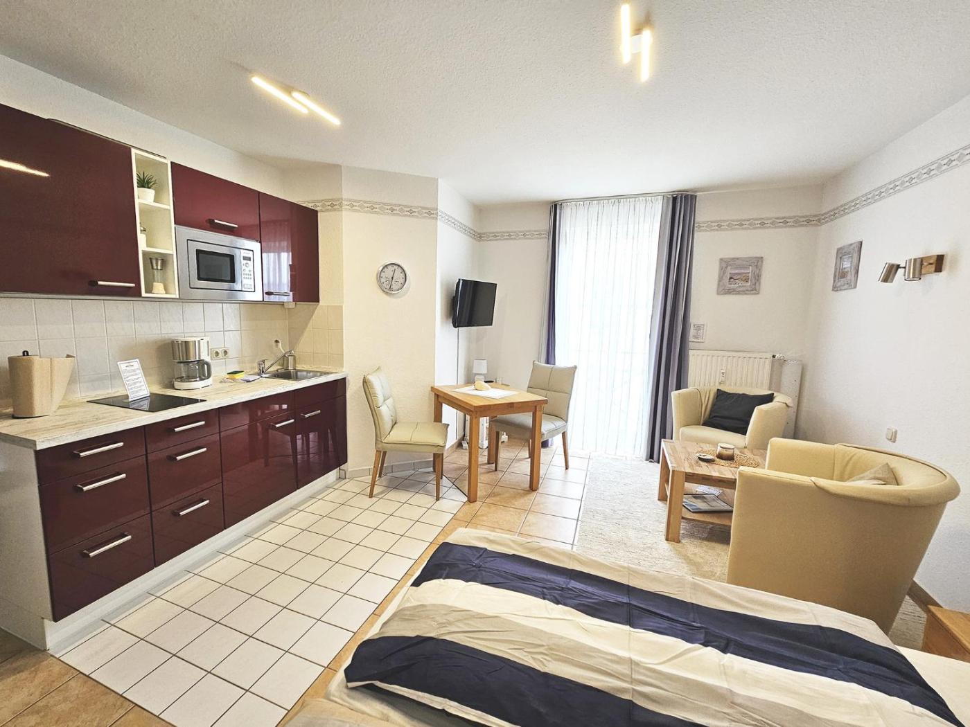Apartment. This apartment comes with 1 bedroom, kitchen and 1 bathroom with a shower. In the well-equipped kitchen, guests will find a stovetop, a refrigerator, a microwave and a toaster. This apartment has a coffee machine, heating and a TV. The unit has 1 bed.