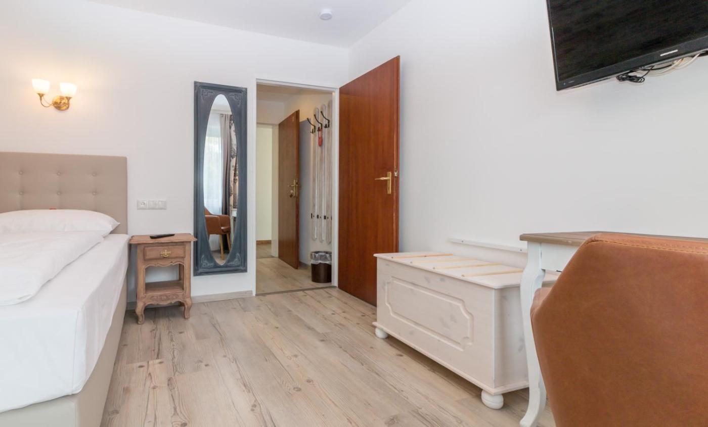 Single Room. Modern room featuring a flat-screen TV, small fridge, a private bathroom and a terrace or a balcony with garden views. ;