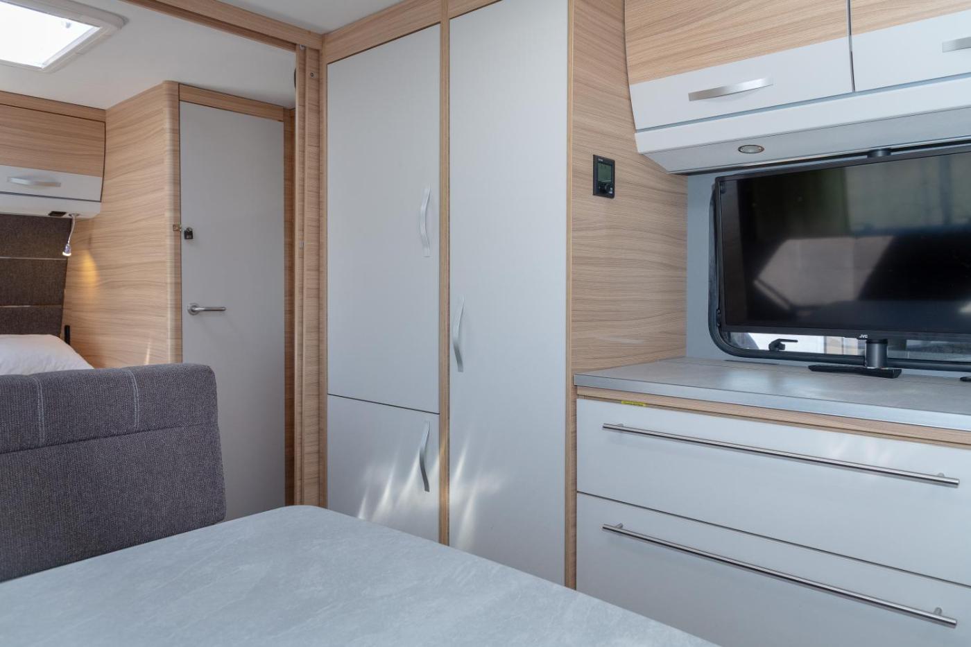 Caravan. Featuring a seating area, a dining area and a wardrobe, this mobile home includes a shared bathroom. Meals can be prepared in the well-fitted kitchenette, which features a stovetop, a refrigerator, kitchenware and a toaster. This mobile home has a private entrance, a coffee machine, a flat-screen TV with satellite channels and a terrace. The unit has 4 beds.